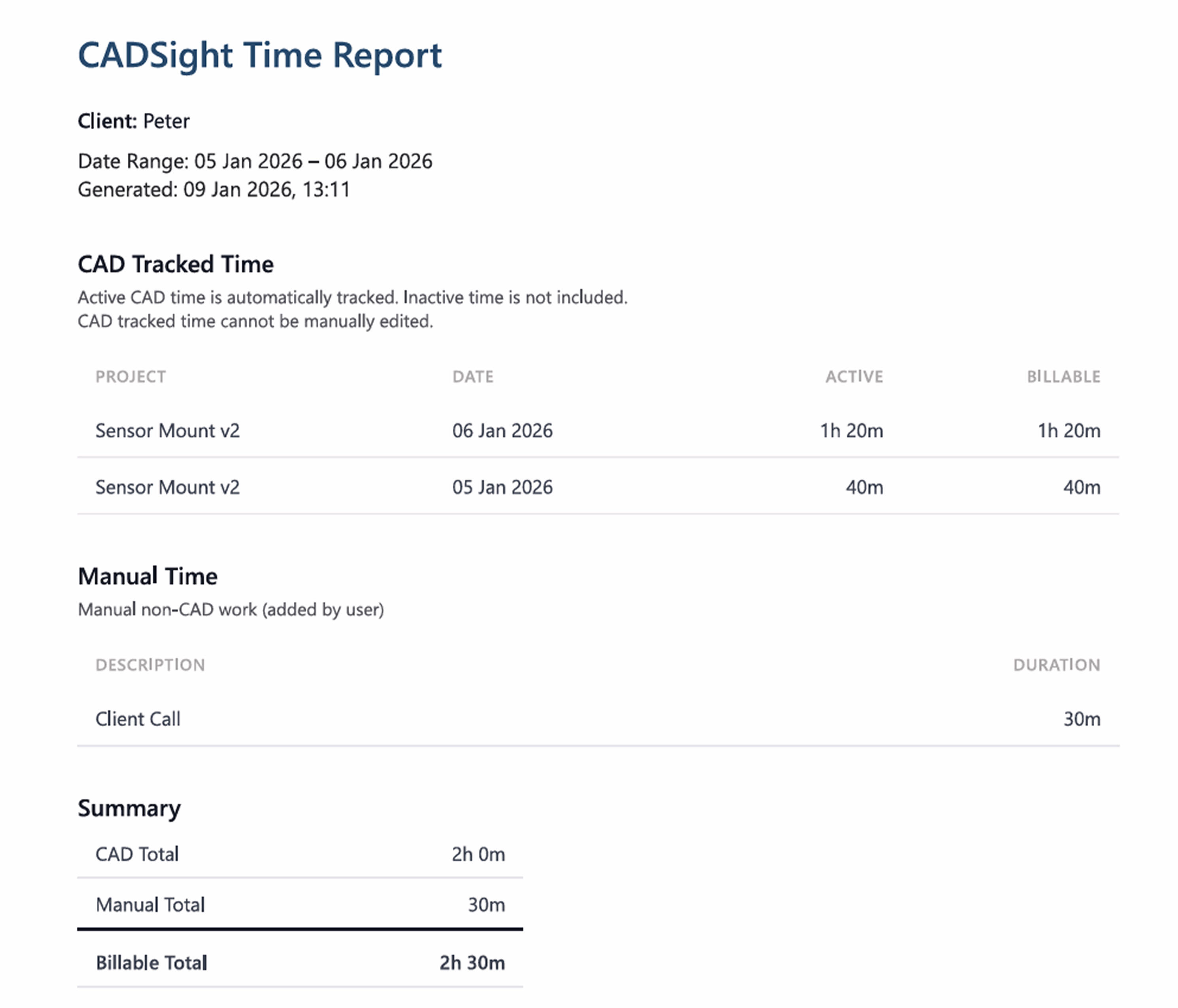 Track your CAD work automatically and generate clean reports for clients.